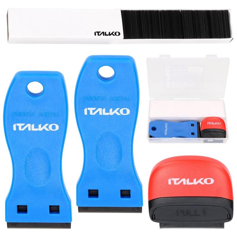 Zestaw ITALKO przeznaczony do szybkiego i bezpiecznego usuwania folii, naklejek oraz pozostałości kleju. W komplecie znajdują się 3 poręczne skrobaki oraz 100 wymiennych ostrzy, co zapewnia długą eksploatację i możliwość pracy zawsze ostrą krawędzią bez szarpania materiału.