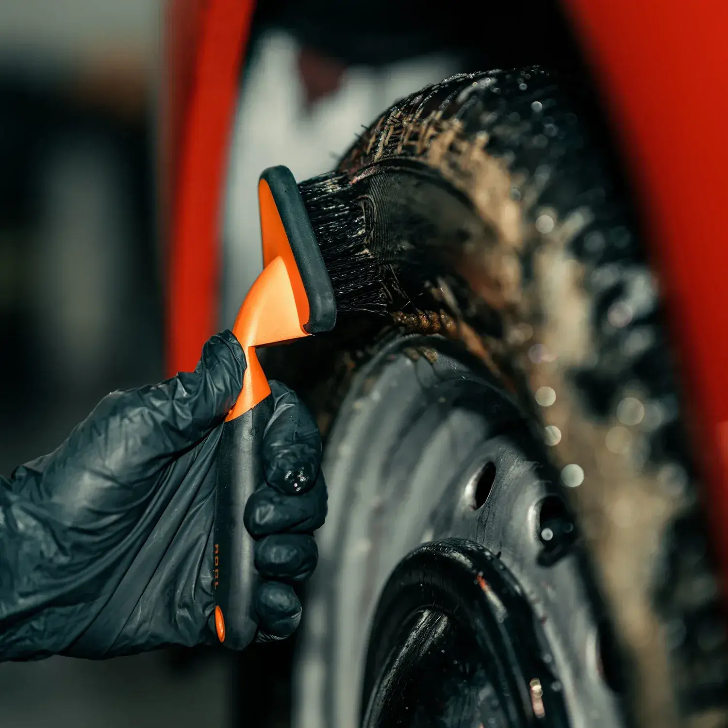 Szczotka do czyszczenia opon o różnych rodzajach bieżnika. Wykonana jest z wysokiej jakości tworzywa sztucznego i włosia syntetycznego. Ergonomiczny uchwyt, pokryty jest warstwą gumy antypoślizgowej. Główka ułożona w kształt trójkąta oraz odpowiednio twarde włosie umożliwia skuteczne dotarcie i czyszczenie nawet trudno dostępnych miejsc.