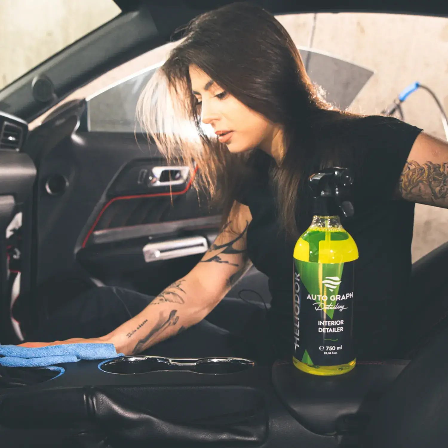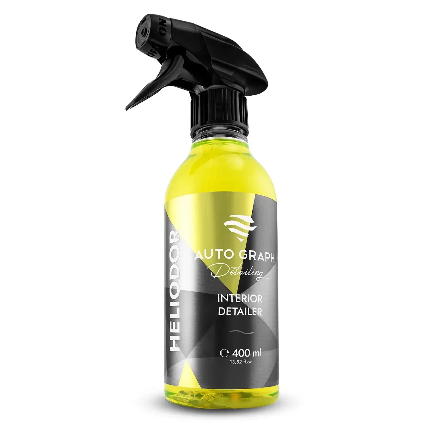 Czy jeden produkt może nie tylko wyczyścić, ale także pielęgnować wszystkie powierzchnie wewnątrz samochodu – tworzywa sztuczne, tekstylia, welur, drewno czy alcantarę, a także ekrany LCD? Sprawdź HELIODOR Interior Detailer. Jest niezwykle uniwersalny, skuteczny, a jednocześnie bezpieczny dla wszystkich powierzchni wewnątrz auta. Idealnie nada się do tak zwanego bonetowania, czyli ręcznego czyszczenia tapicerki i podsufitki. Nie wymaga wypłukiwania na mokro. Usuwa zabrudzenia, nadając powierzchni naturalny wygląd i pozostawiając satynowe wykończenie. Właściwości:
