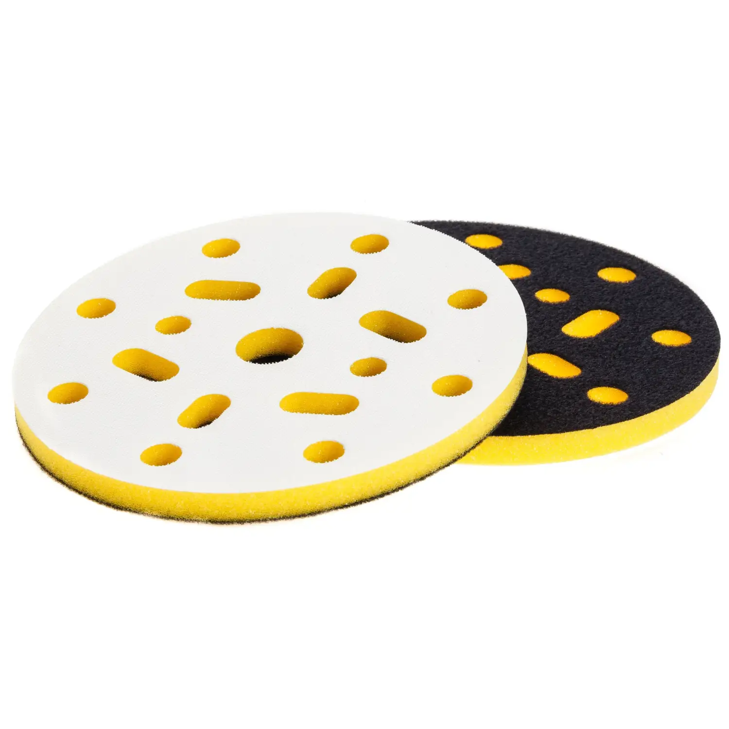 Dysk przejściowy oprócz prac wstępnych może służyć do wykańczania delikatnych łuków i profili. Przekładka dystansowa wykonana z komponentów do prac wstępnych. Podobnie jak w przypadku padów, zastosowano tu europejskie certyfikowane komponenty. Dzięki czemu produkt jest odporny na kurz, wodę i wysokie temperatury. We wszystkich przekładkach zastosowaliśmy system otworów jak w powszechnie używanych papierach ściernych. Dzięki czemu przekładki są kompatybilne z okrągłymi krążkami papierów ściernych mocowanych na rzep. Pianki w przekładkach występują w czterech twardościach, aby swobodnie dobrać optymalne zawieszenie do wykonywanych prac i oczekiwanych rezultatów.