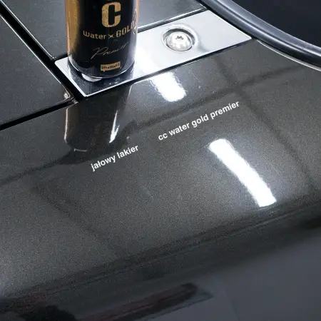Czas, który spędzasz z CC Water Gold Premier będzie dla Ciebie chwilą kontemplacji tego lśnienia. Nie masz zbyt dużo wolnego czasu i nie możesz pozwolić sobie na włożenie mnóstwa wysiłku w pielęgnację swojego ukochanego auta, ale mimo to chciałbyś, by zawsze prezentowało się jak najlepiej i błyszczało nawet piękniej niż po nałożeniu powłoki w profesjonalnym salonie? Tacy wymagający klienci powinni spróbować naszego CC Water Gold Premier. To produkt, którego zastosowanie da efekty satysfakcjonujące nie tylko fanów linii CC Water Gold, ale także osoby używające tych kosmetyków po raz pierwszy. Opracowując CC Water Gold Premier nie szczędziliśmy składników nabłyszczających i dołożyliśmy wszelkich starań, by zapewnić równowagę między efektem hydrofobowym a komfortem użytkowania. Dodatkowo w porównaniu z wcześniejszymi produktami użyliśmy więcej składników premium dających głęboki, szklany efekt, dzięki czemu udało się uzyskać powłokę w sprayu, która zapewnia błysk silniejszy niż zabiegi wykonywane przez profesjonalistów. Nowa mieszanka gwarantującej wytrzymałość żywicy znacząco polepszyła hydrofobowość i trwałość, dzięki czemu nasz produkt zapewnia blask i wodoodporność na znacznie dłużej niż jego poprzednicy. CC Water Gold Premier to kosmetyk, który pozwala osiągnąć połysk i odporność na wodę lepsze niż po wizycie w profesjonalnym salonie, a wszystko to w formie prostego do nałożenia sprayu. Dzięki temu można go stosować nie tylko w dni wolne, ale także korzystając z chwili czasu w trakcie podróży. Z każdym nałożeniem auto będzie błyszczało jeszcze mocniej. CC Water Gold Premier podtrzymuje tradycję prostoty użycia, która cechowała jego poprzedników. Nieważne, czy karoseria jest jeszcze mokra po myciu, czy też sucha – wystarczy rozpylić spray i przetrzeć, by nałożyć powłokę.