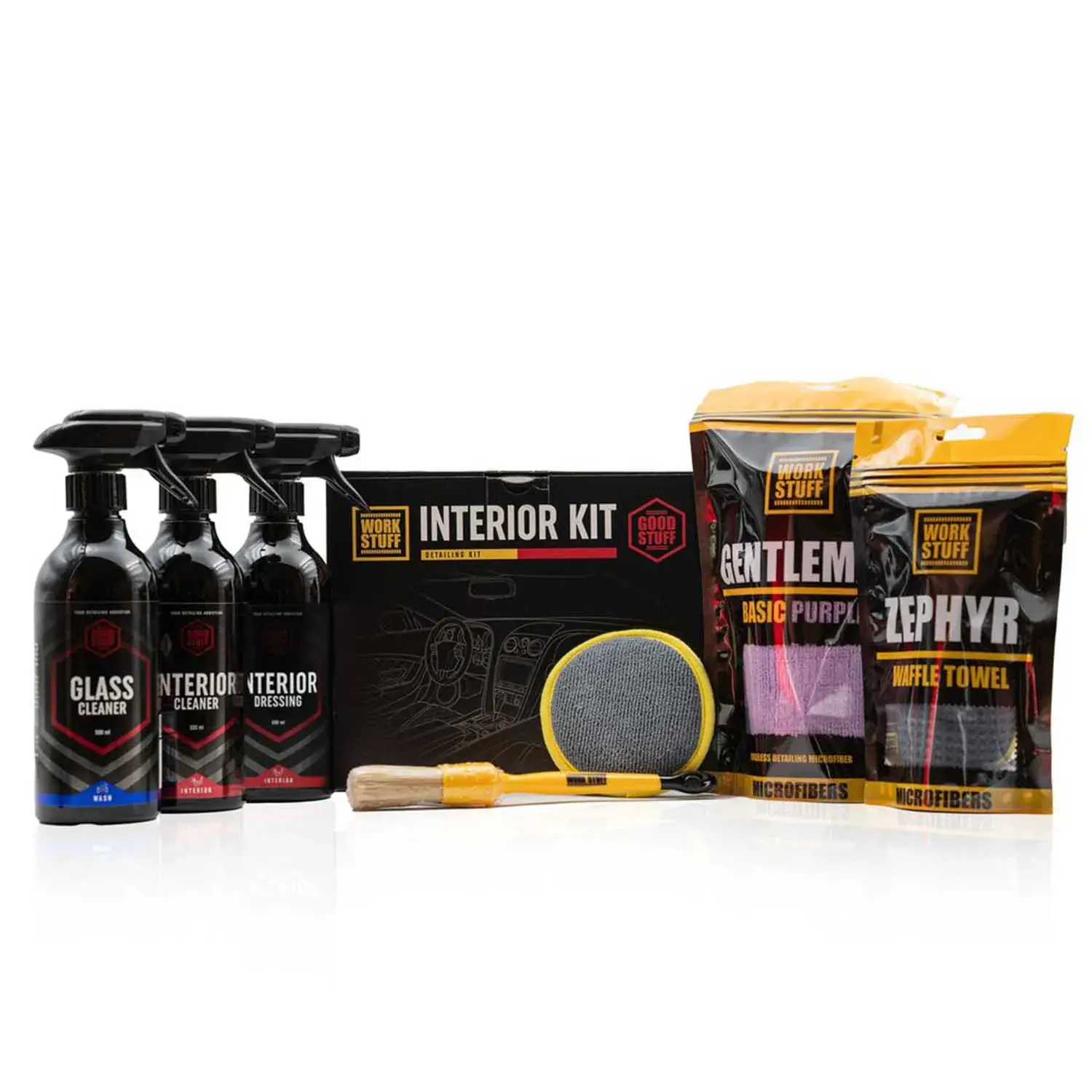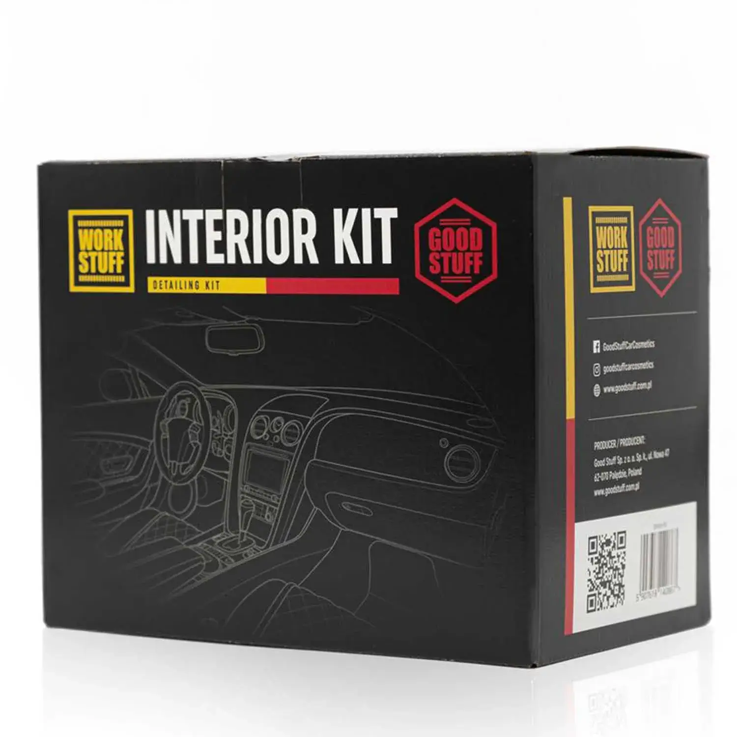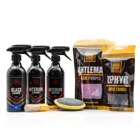 Podstawowy zestaw do mycia auta wewnątrz. W specjalnie przygotowanym BOXie znajduje się aż 7 produktów do pielęgnacji wnętrza samochodu. Odpowiednio 3 preparaty kosmetyczne od GOOD STUFF oraz 4 niezbędne akcesoria marki WORK STUFF. Za ich pomocą można wyczyścić plastiki, elementy gumowe oraz kokpit i nałożyć dedykowany dressing. Dodatkowo w skład pudełka wchodzi płyn do mycia szyb razem z dedykowaną mikrofibrą.