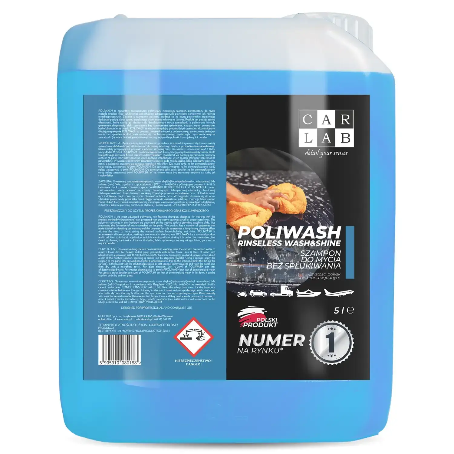 CARLAB Poliwash Blue 5 L to wydajny, polimerowy szampon bez spłukiwania, który czyści, nabłyszcza i nadaje hydrofobowość. Idealny do lakieru, szyb i wnętrza.