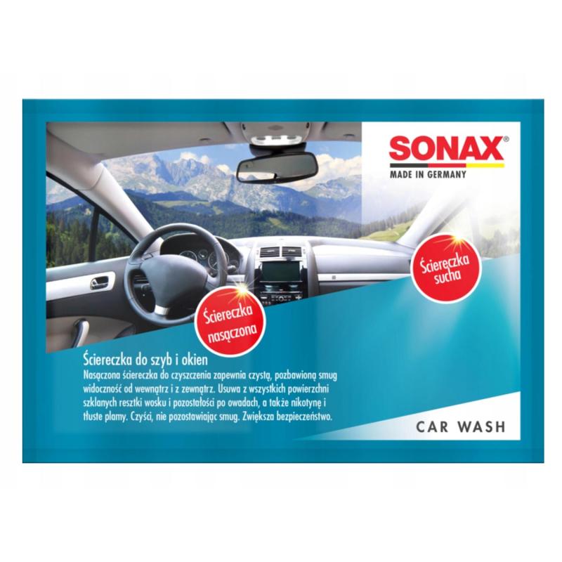 Ściereczki Sonax do szyb i lusterek – usuwa wosk, osady i smugi po myjni. Zestaw 2w1: ściereczka nawilżana + sucha. Idealna widoczność w każdej sytuacji.
