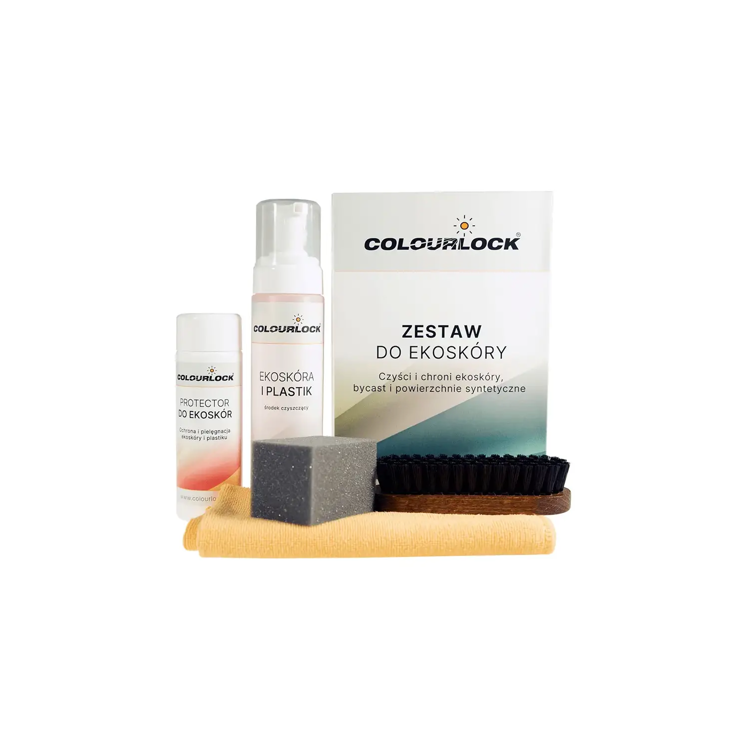 Zestaw COLOURLOCK zawiera wszystko, czego potrzebujesz do czyszczenia i pielęgnacji ekoskór i plastikowych powierzchni. Silnie zabrudzone powierzchnie ponownie stają się czyste. Użyj miękkiej szczotki zawartej w zestawie do czyszczenia powierzchni.