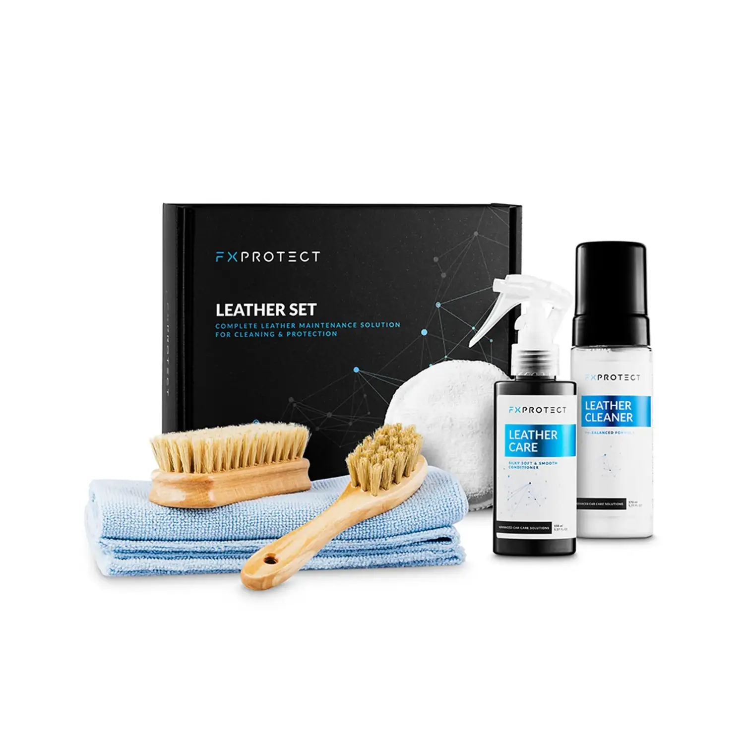 Leather Set to kompletny zestaw zawierający zarówno środek czyszczący, jak i zabezpieczający, a także wszystkie niezbędne akcesoria takie jak dwie szczotki, mikrofibrę i aplikator.