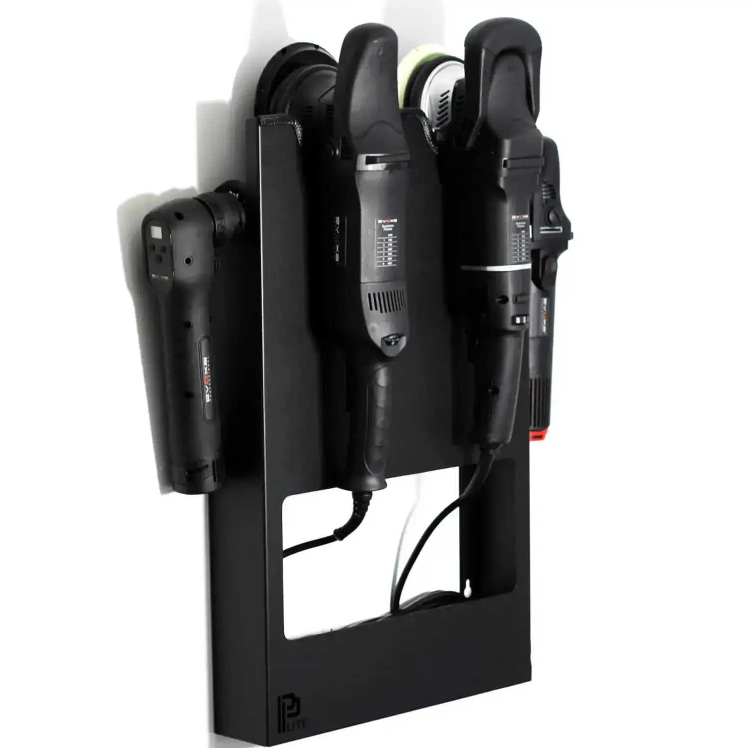 POKA PREMIUM LITE – solidny wieszak na 2–4 maszyny polerskie z półką na kable. Wykonany z malowanej proszkowo stali. Perfekcyjny do studia detailingu.