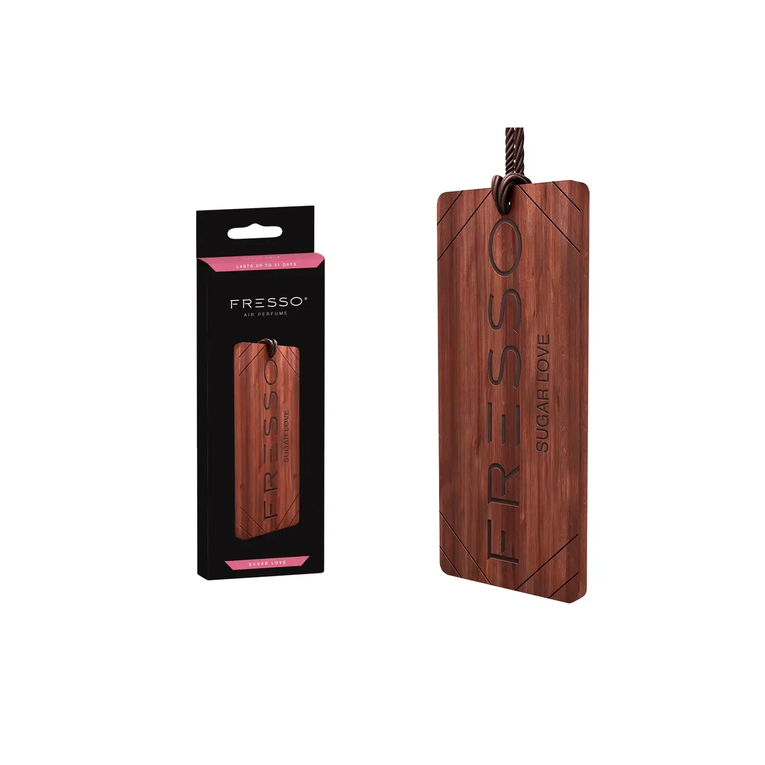 Elegancka, drewniana zawieszka zapachowa wzbogacona w brązowy, pleciony sznurek to wyszukany dodatek, który będzie znakomicie pasował do każdego wnętrza samochodu.